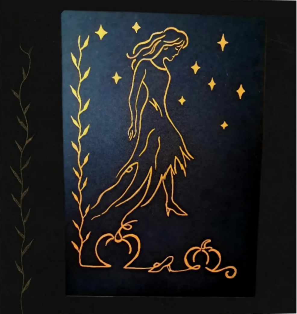 Oeuvre réalisée à l’aquarelle métallique dorée avec sous couche blanc de Chine sur papier noir hydrocellulose Van Gogh 360g/m2.