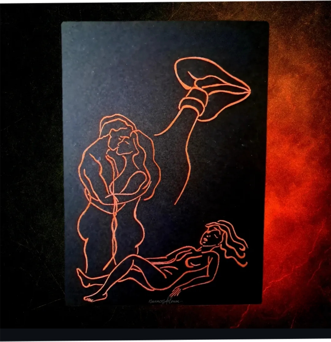 Oeuvre réalisée à l’aquarelle métallique cuivrée avec sous couche blanc de Chine sur papier noir hydrocellulose Van Gogh 360g/m2.