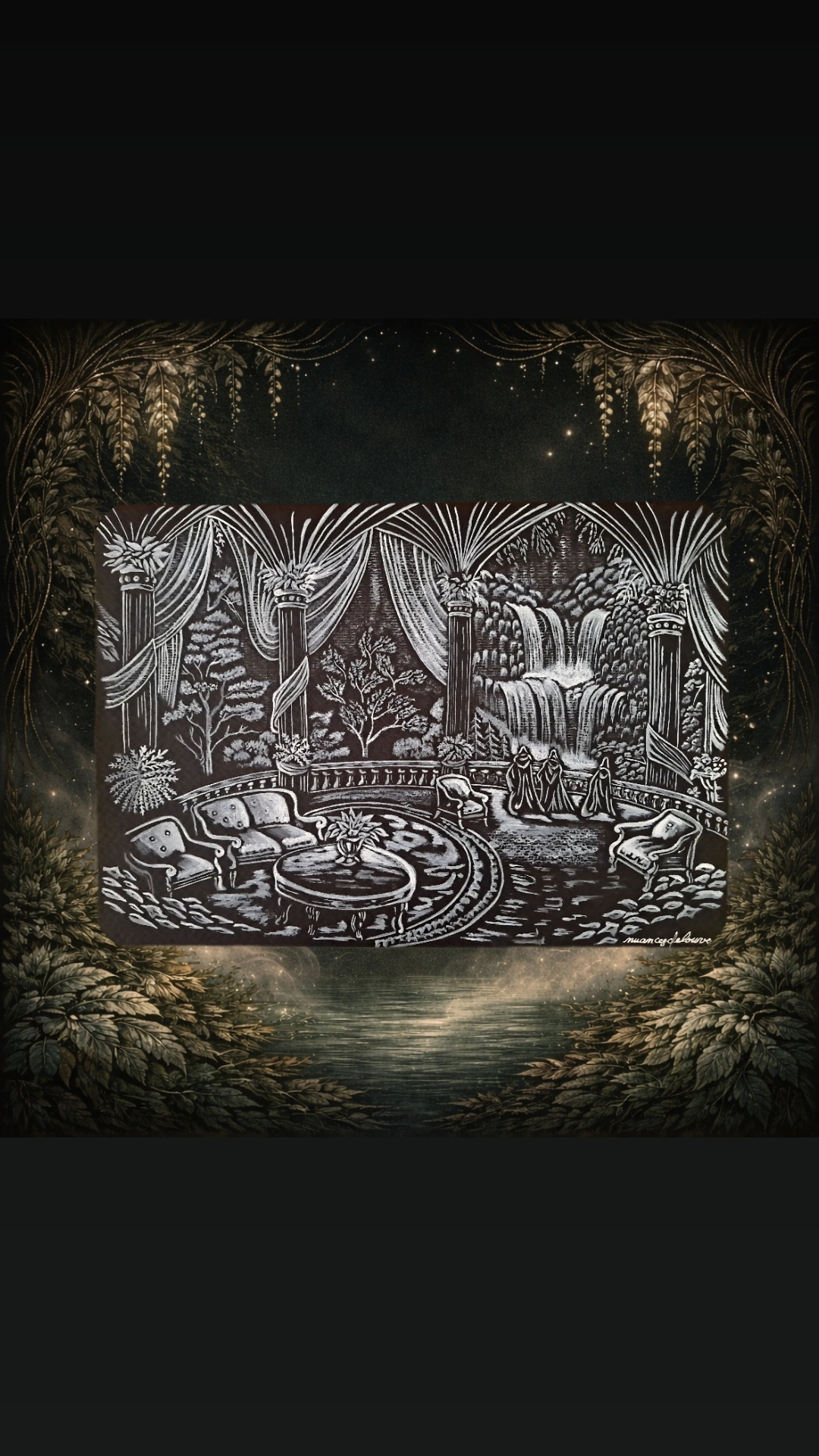 Oeuvre réalisée à l’aquarelle blanc de Chine Winsor & Newton sur papier noir hydrocellulose Van Gogh 360g/m2.