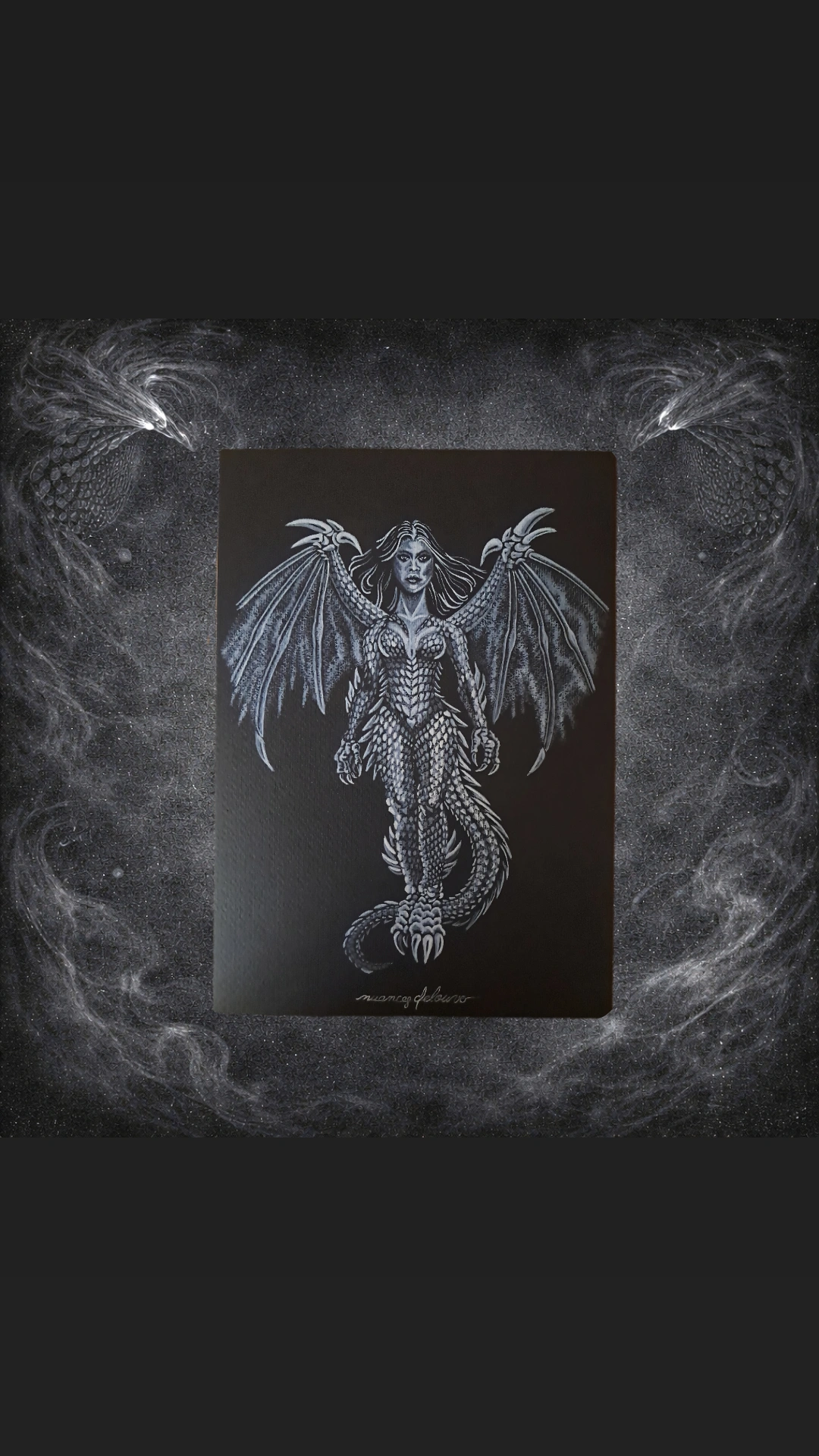 Aquarelle originale représentant un hybride femme-dragon, une chimère.